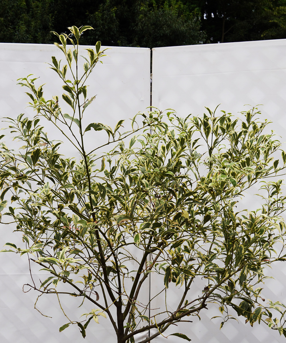 フイリヤブニッケイは、常緑樹の中でも数少ない斑入りで、さらに葉の細かい美しい木です。薄めの緑色の葉に、白い覆輪の斑が入ります。葉の茂りが良いので目隠しとしても使えます。