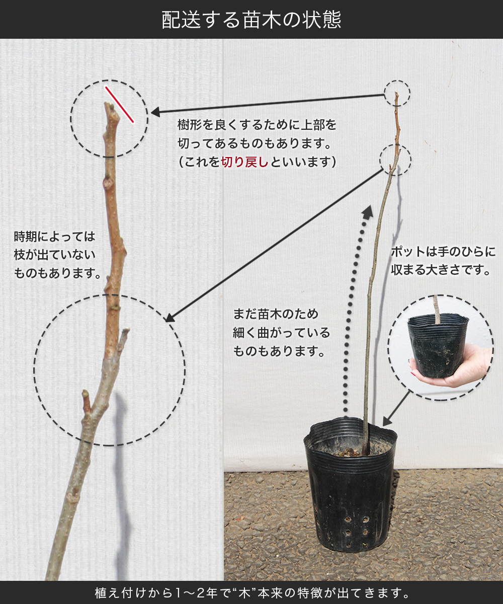 - 1本では結実しないため必ず他の品種と一緒に植える。