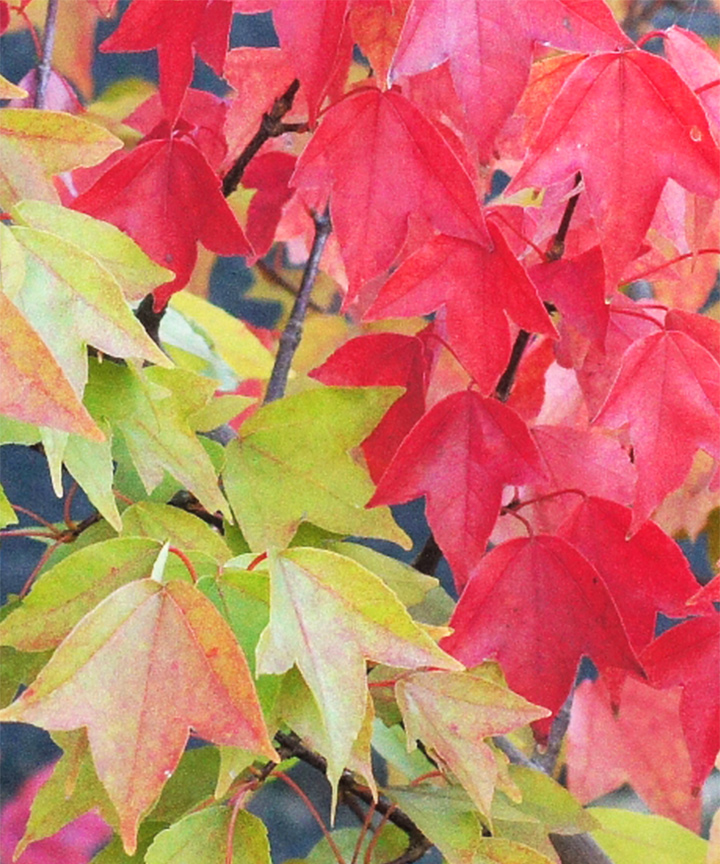 - 三俣に分かれた深緑の葉で、秋は燃えるような紅葉を楽しむことができます。幹肌は成長するに従い、樹皮がめくれてくるのも鑑賞価値の一つ。樹形は一見暴れますが、自然と味のある樹形に整っていきます。 高さや幅が共に出やすい木ですので、早めに希望の高さに切り詰めることをお勧めします。