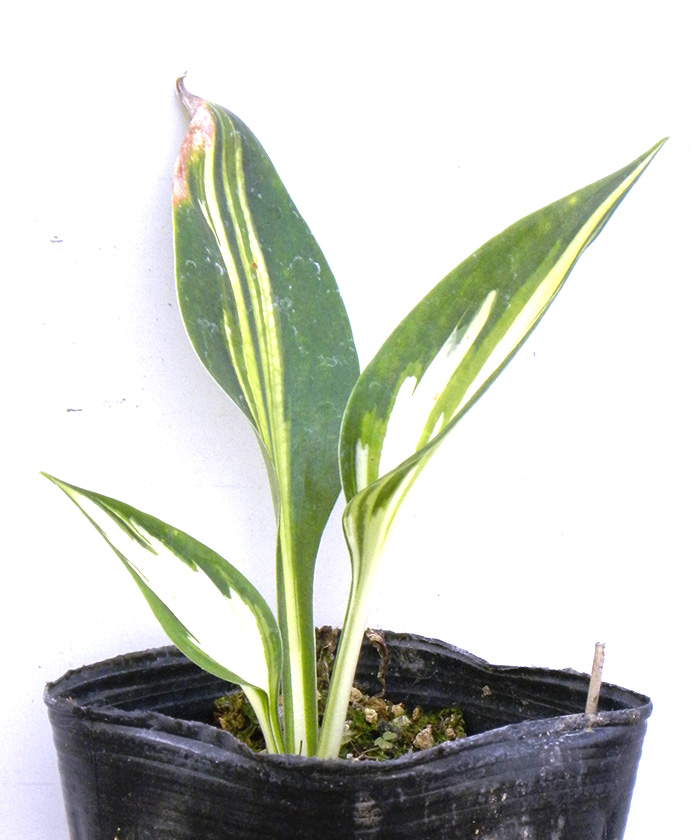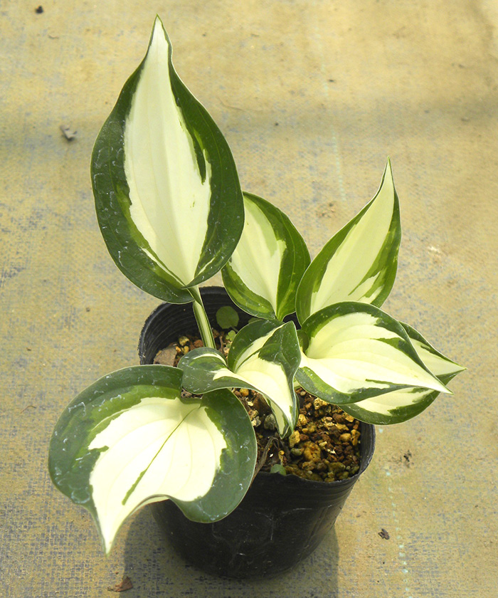ギボウシの中でも大きな中斑(なかふ)の品種です。まるで炎の揺らめきのような斑の形が印象的は希少品種です。花は花茎を上に長く伸ばしラッパのようなかわいい花を付けます。