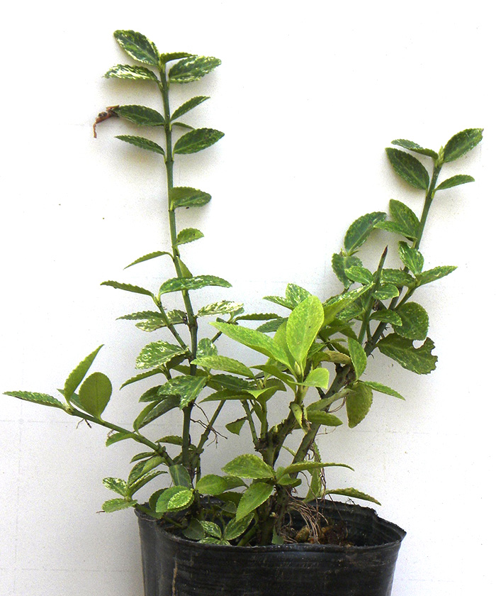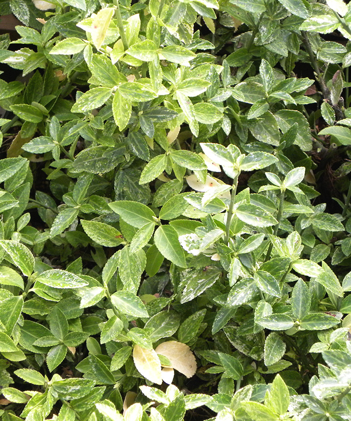 葉に散り斑(ふ)の入る品種。成長の過程で葉色が変化するため、一年を通して葉色が変化する。