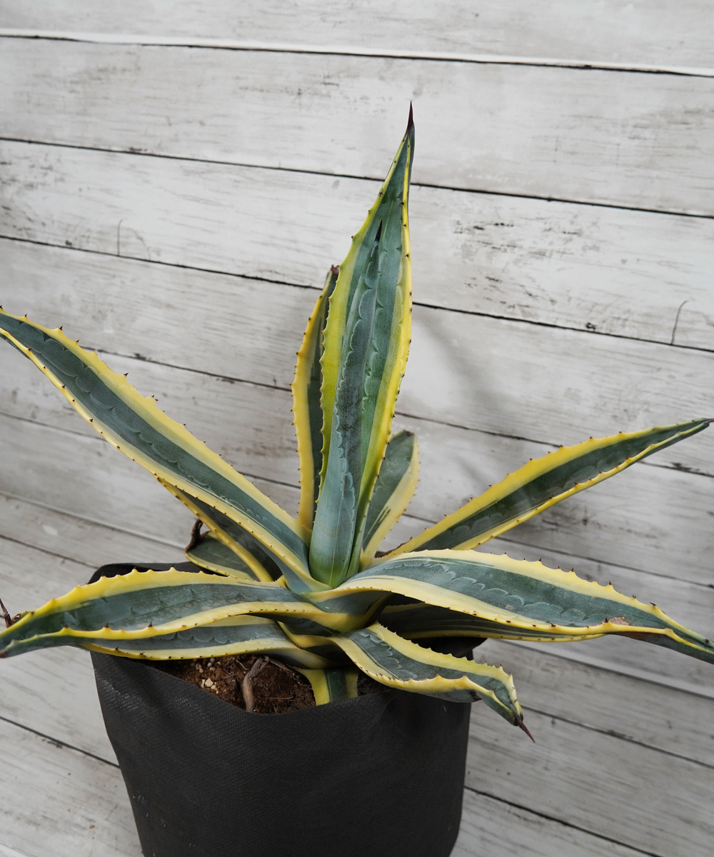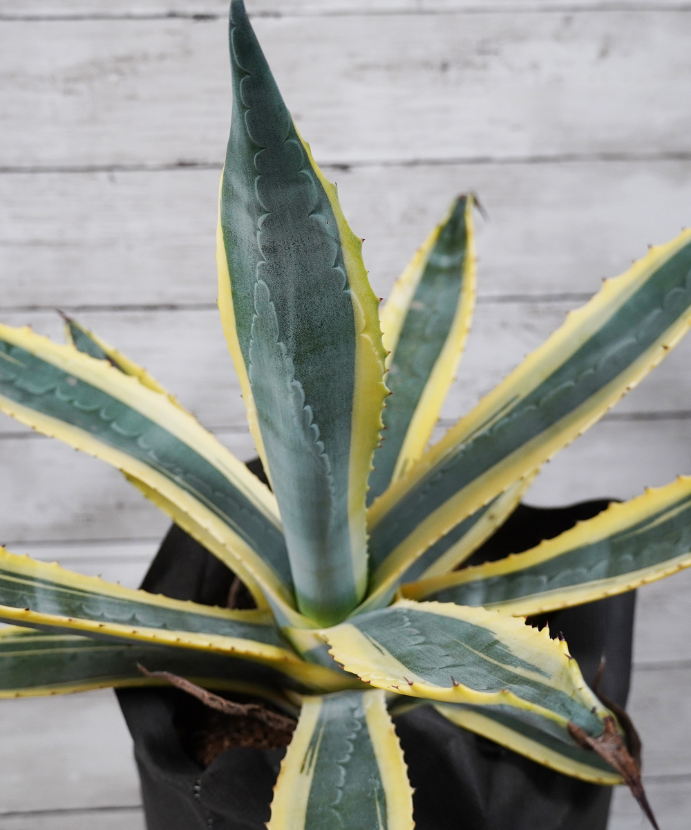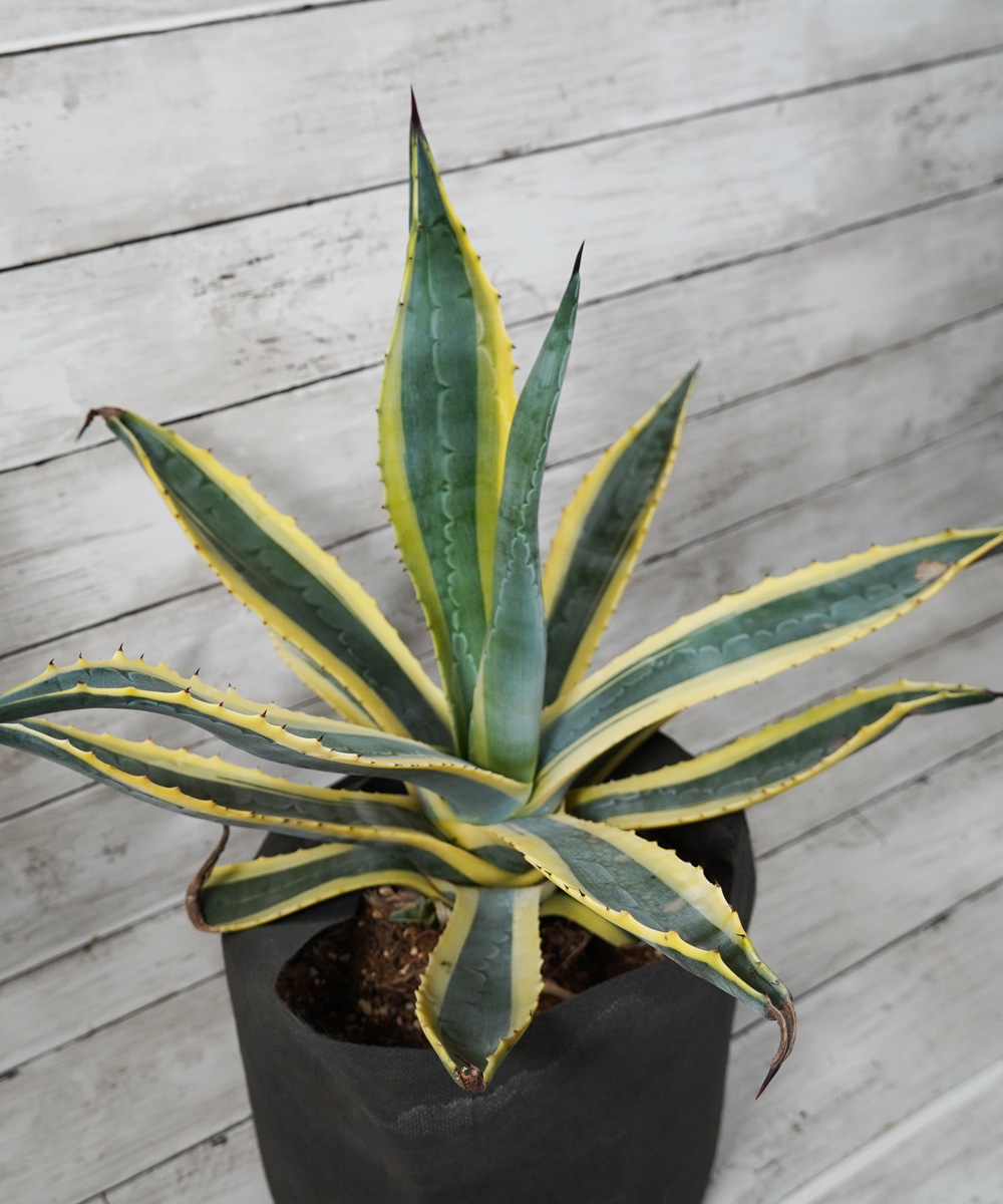 - アガベの中でも耐寒性の強い種類です。アメリカーナの葉に黄色い斑が入るタイプで明るい印象があります。アメリカーナのシルエットはそのままに違った葉色を楽しむことができます。耐寒性は-10度まで耐えると言われていますが、その場合はかなり傷みます。-7度程度でも痛みは避けられません。植物の先には鋭いとげがありますので取り扱いには注意が必要です。