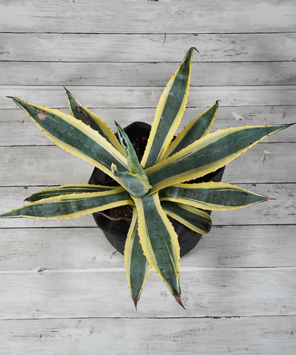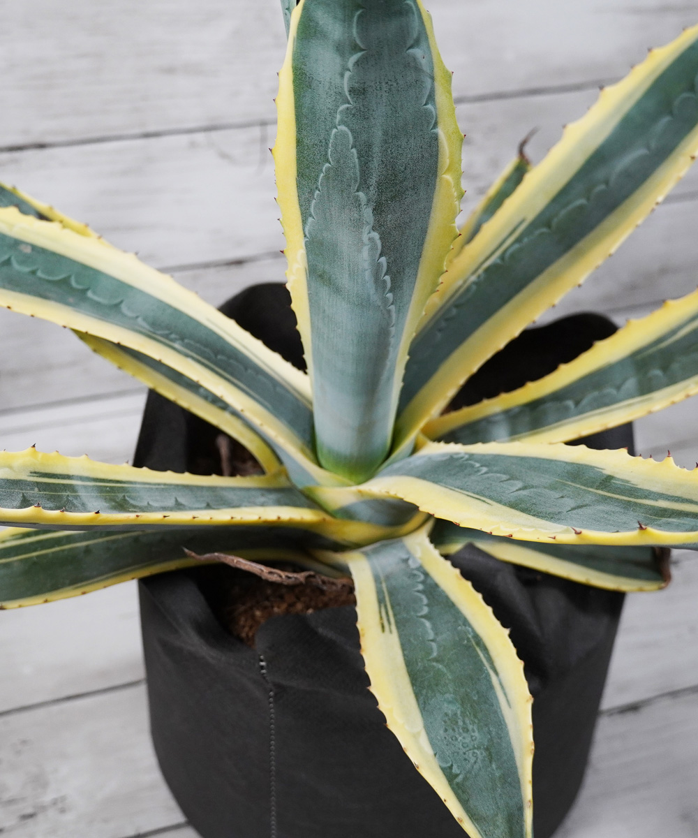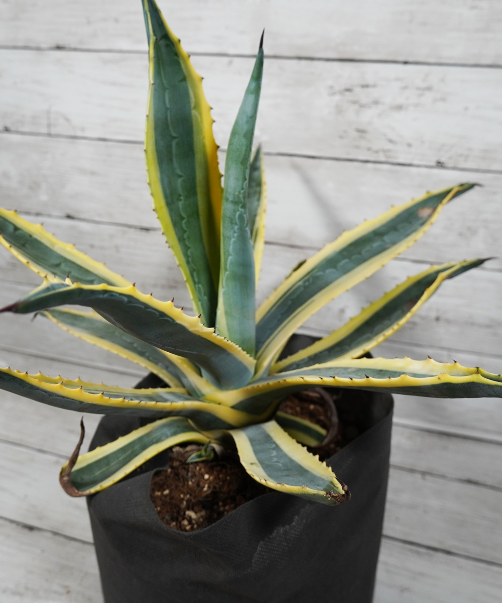 - アガベの中でも耐寒性の強い種類です。アメリカーナの葉に黄色い斑が入るタイプで明るい印象があります。アメリカーナのシルエットはそのままに違った葉色を楽しむことができます。耐寒性は-10度まで耐えると言われていますが、その場合はかなり傷みます。-7度程度でも痛みは避けられません。植物の先には鋭いとげがありますので取り扱いには注意が必要です。