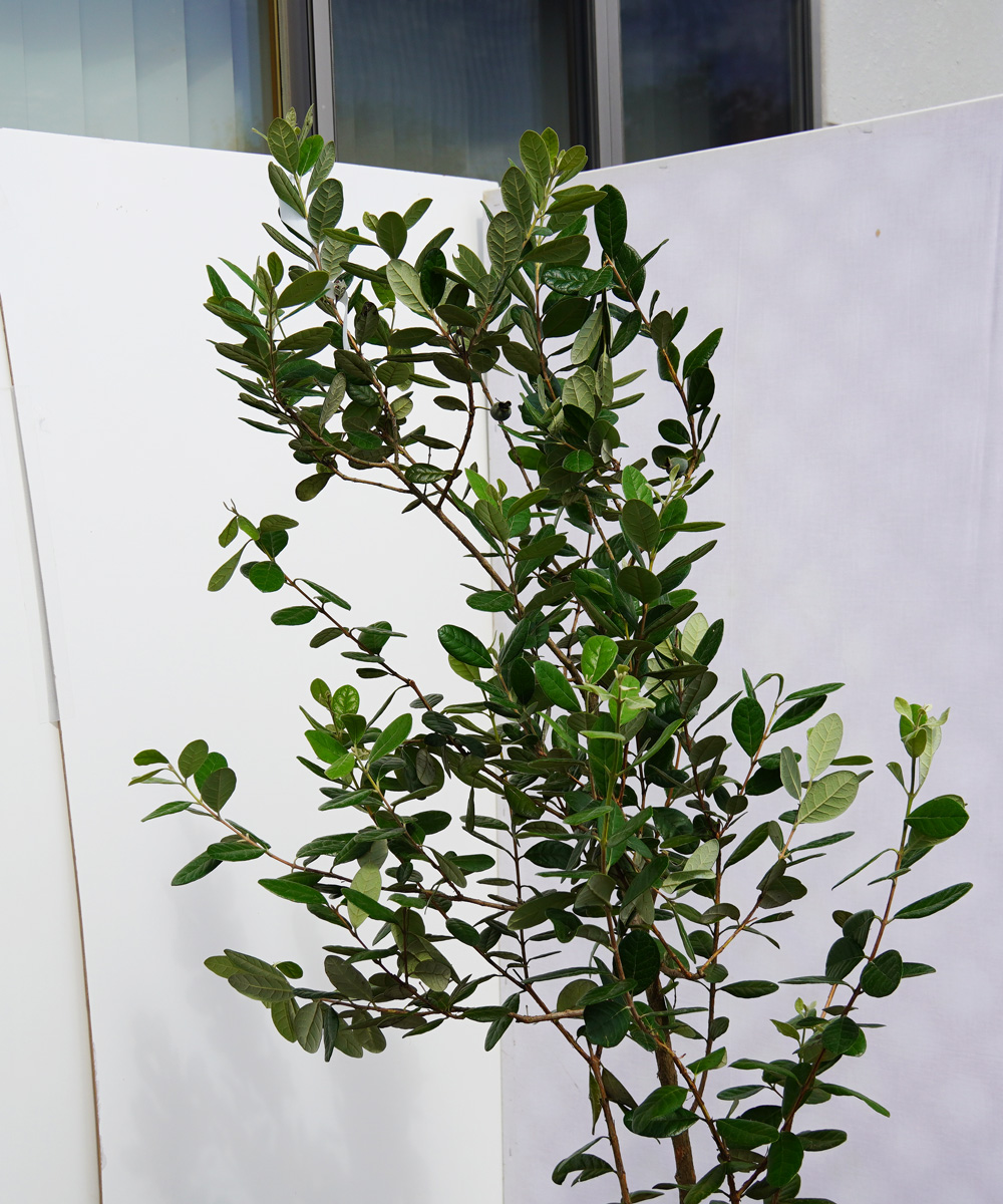 - フェイジョアは、南米原産の常緑果樹です。日本では果物としては定着せず、そのまま家庭菜園用の果樹となりましたが、常緑で丸く青みがかった葉色が特徴的で、あまり大きくならない庭木として近年注目されています。しかし、フェイジョアは果樹として販売されることが多いため、樹形が整ったものが多くありません。こちらは、庭木として使えるように樹形をきれいに仕立てています。もともとは中木に近いため、最終樹高はそれほど大きくなりません。なのでそこそこの大きさで、樹形をきれいに仕立ててあるものはあまり販売されていません。こちらのフェイジョアは品種不明のため花が咲いても結実しない場合があります。