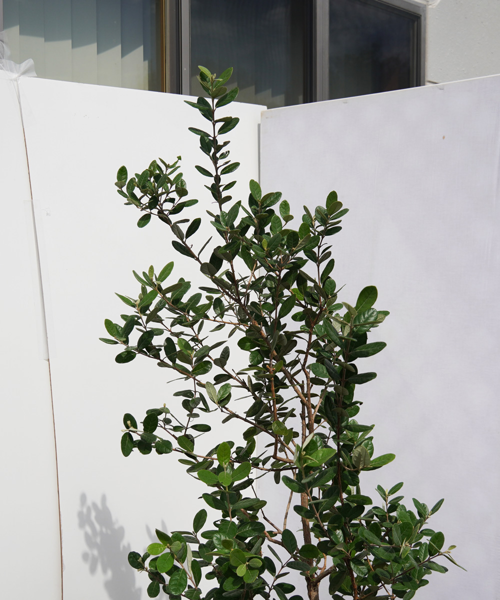 - フェイジョアは、南米原産の常緑果樹です。日本では果物としては定着せず、そのまま家庭菜園用の果樹となりましたが、常緑で丸く青みがかった葉色が特徴的で、あまり大きくならない庭木として近年注目されています。しかし、フェイジョアは果樹として販売されることが多いため、樹形が整ったものが多くありません。こちらは、庭木として使えるように樹形をきれいに仕立てています。もともとは中木に近いため、最終樹高はそれほど大きくなりません。なのでそこそこの大きさで、樹形をきれいに仕立ててあるものはあまり販売されていません。こちらのフェイジョアは品種不明のため花が咲いても結実しない場合があります。