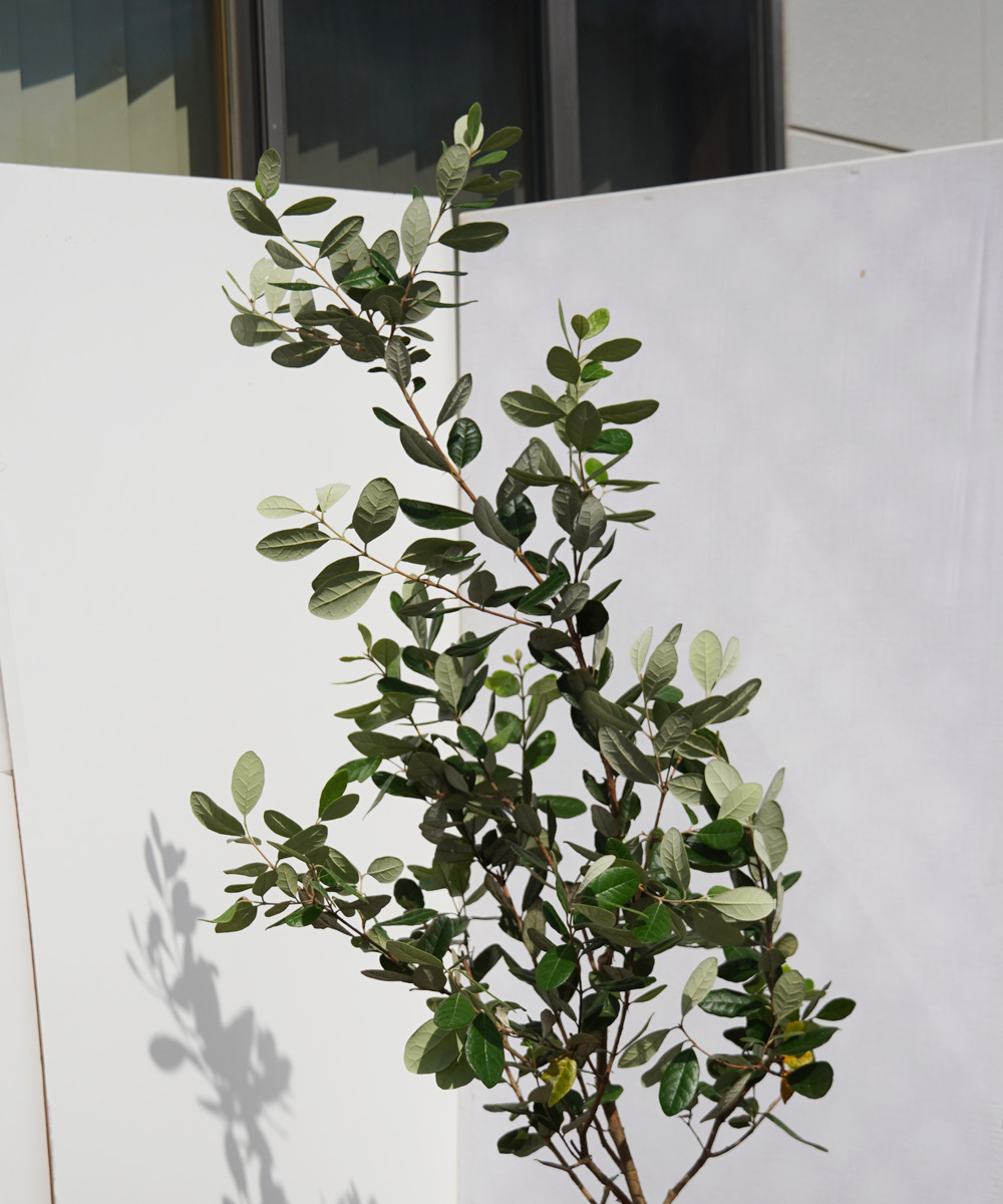 - フェイジョアは、南米原産の常緑果樹です。日本では果物としては定着せず、そのまま家庭菜園用の果樹となりましたが、常緑で丸く青みがかった葉色が特徴的で、あまり大きくならない庭木として近年注目されています。しかし、フェイジョアは果樹として販売されることが多いため、樹形が整ったものが多くありません。こちらは、庭木として使えるように樹形をきれいに仕立てています。もともとは中木に近いため、最終樹高はそれほど大きくなりません。なのでそこそこの大きさで、樹形をきれいに仕立ててあるものはあまり販売されていません。こちらのフェイジョアは品種不明のため花が咲いても結実しない場合があります。