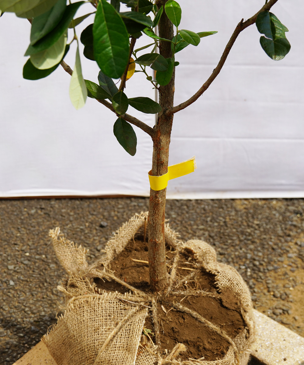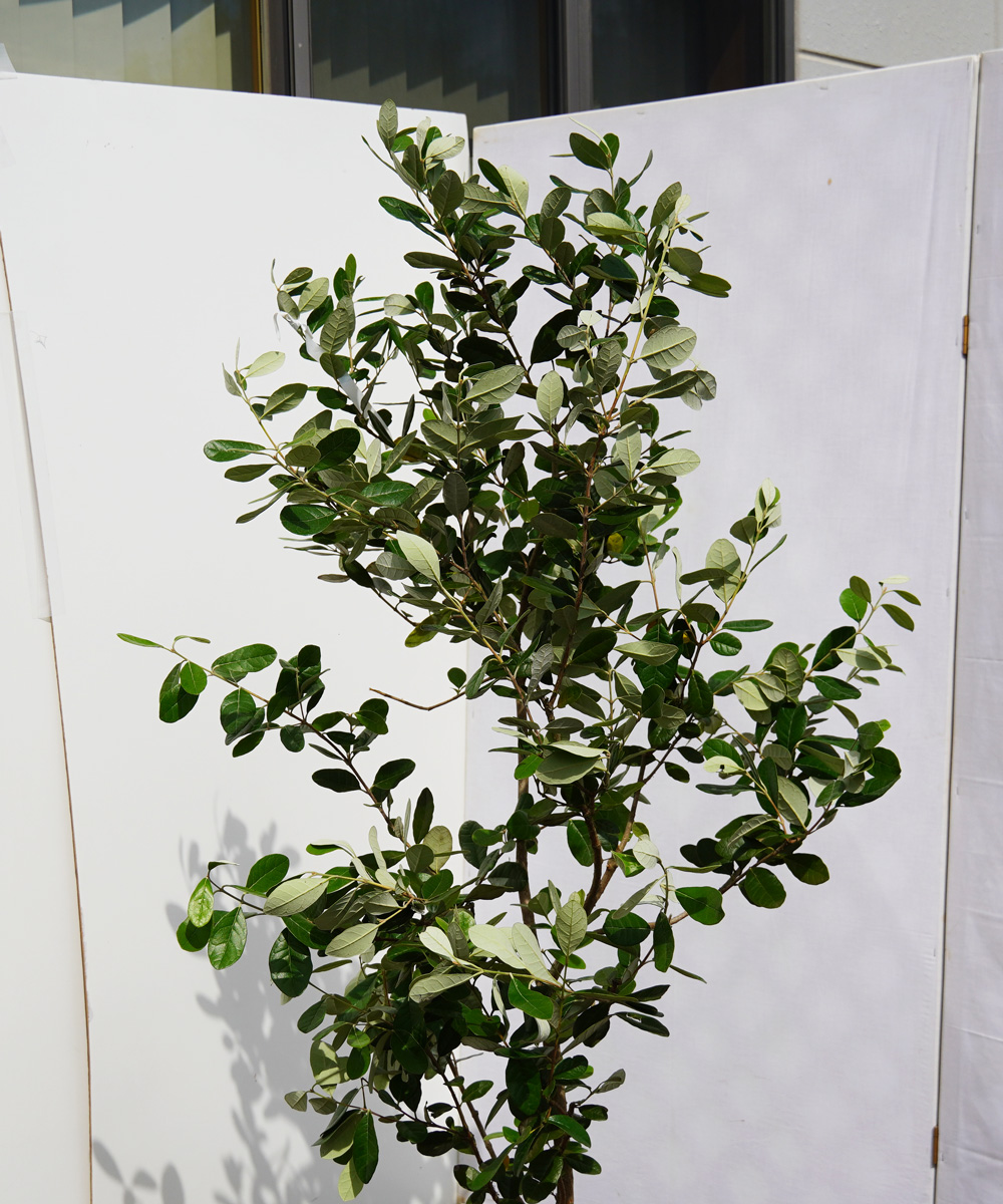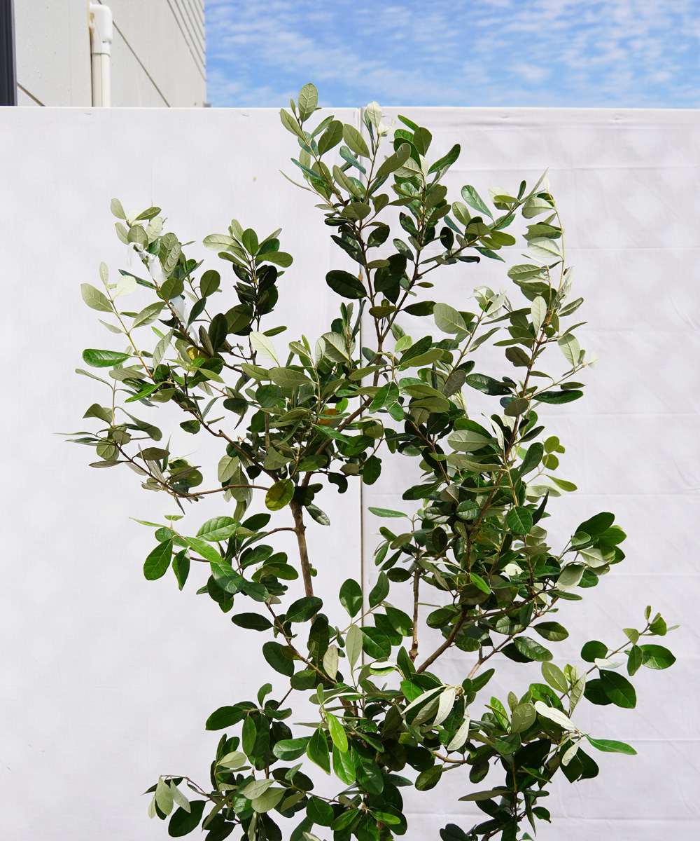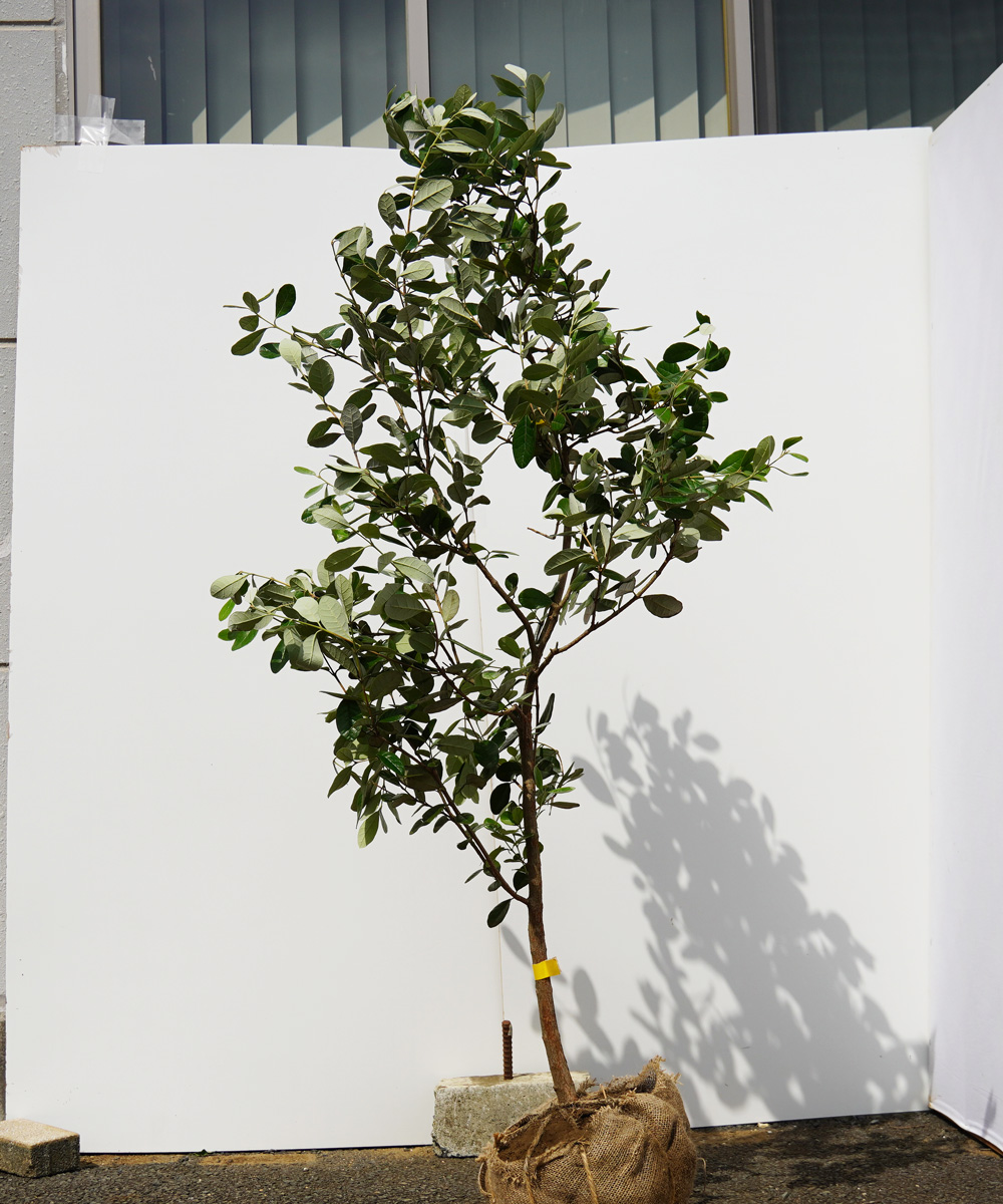 - フェイジョアは、南米原産の常緑果樹です。日本では果物としては定着せず、そのまま家庭菜園用の果樹となりましたが、常緑で丸く青みがかった葉色が特徴的で、あまり大きくならない庭木として近年注目されています。しかし、フェイジョアは果樹として販売されることが多いため、樹形が整ったものが多くありません。こちらは、庭木として使えるように樹形をきれいに仕立てています。もともとは中木に近いため、最終樹高はそれほど大きくなりません。なのでそこそこの大きさで、樹形をきれいに仕立ててあるものはあまり販売されていません。こちらのフェイジョアは品種不明のため花が咲いても結実しない場合があります。