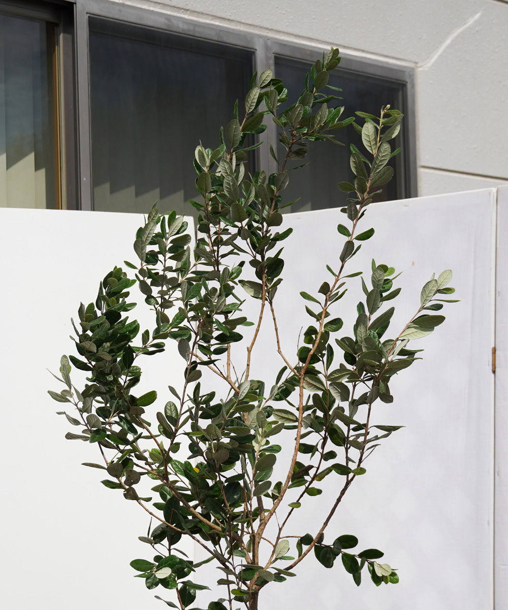 - フェイジョアは、南米原産の常緑果樹です。日本では果物としては定着せず、そのまま家庭菜園用の果樹となりましたが、常緑で丸く青みがかった葉色が特徴的で、あまり大きくならない庭木として近年注目されています。しかし、フェイジョアは果樹として販売されることが多いため、樹形が整ったものが多くありません。こちらは、庭木として使えるように樹形をきれいに仕立てています。もともとは中木に近いため、最終樹高はそれほど大きくなりません。なのでそこそこの大きさで、樹形をきれいに仕立ててあるものはあまり販売されていません。こちらのフェイジョアは品種不明のため花が咲いても結実しない場合があります。