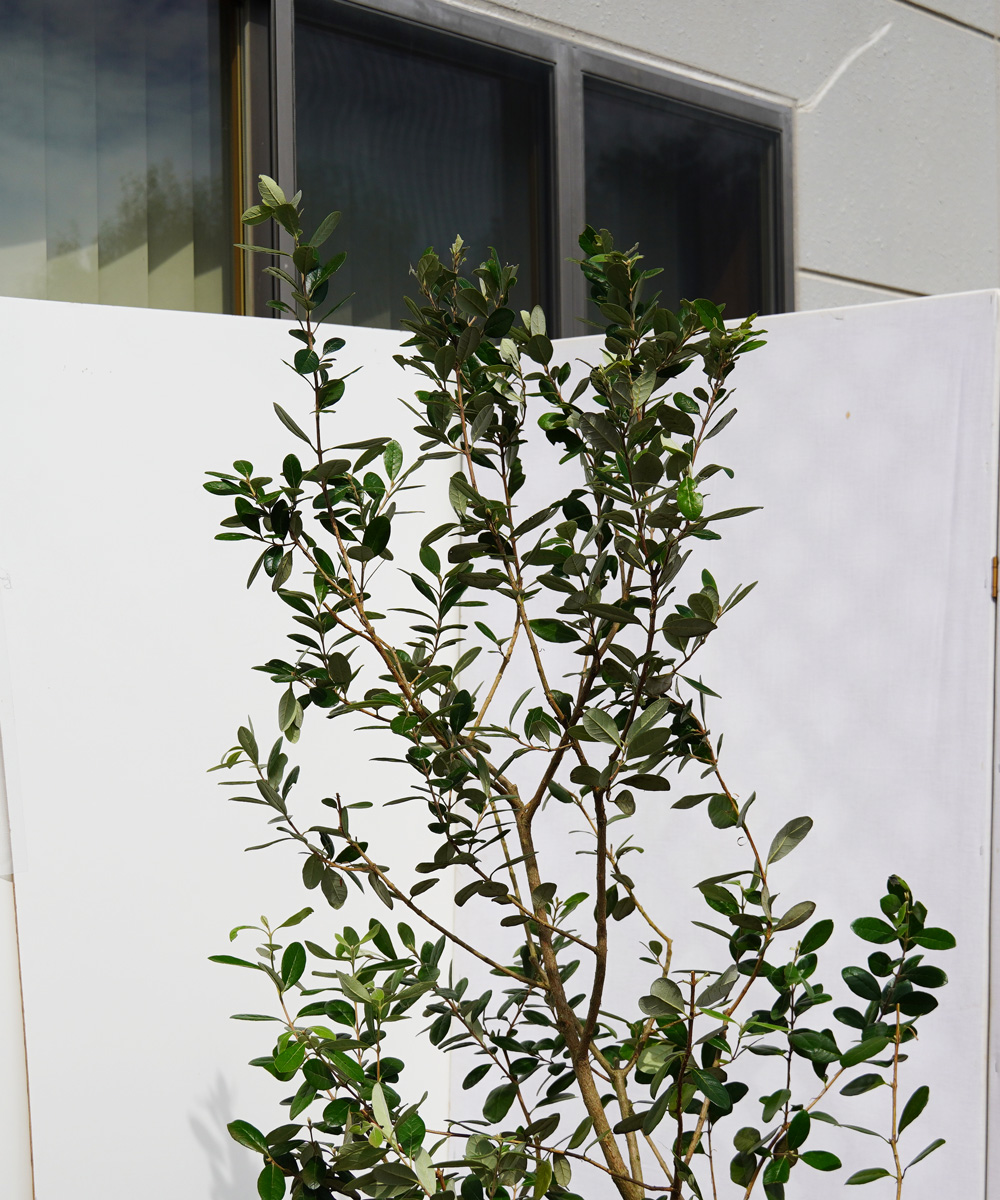 - フェイジョアは、南米原産の常緑果樹です。日本では果物としては定着せず、そのまま家庭菜園用の果樹となりましたが、常緑で丸く青みがかった葉色が特徴的で、あまり大きくならない庭木として近年注目されています。しかし、フェイジョアは果樹として販売されることが多いため、樹形が整ったものが多くありません。こちらは、庭木として使えるように樹形をきれいに仕立てています。もともとは中木に近いため、最終樹高はそれほど大きくなりません。なのでそこそこの大きさで、樹形をきれいに仕立ててあるものはあまり販売されていません。こちらのフェイジョアは品種不明のため花が咲いても結実しない場合があります。
