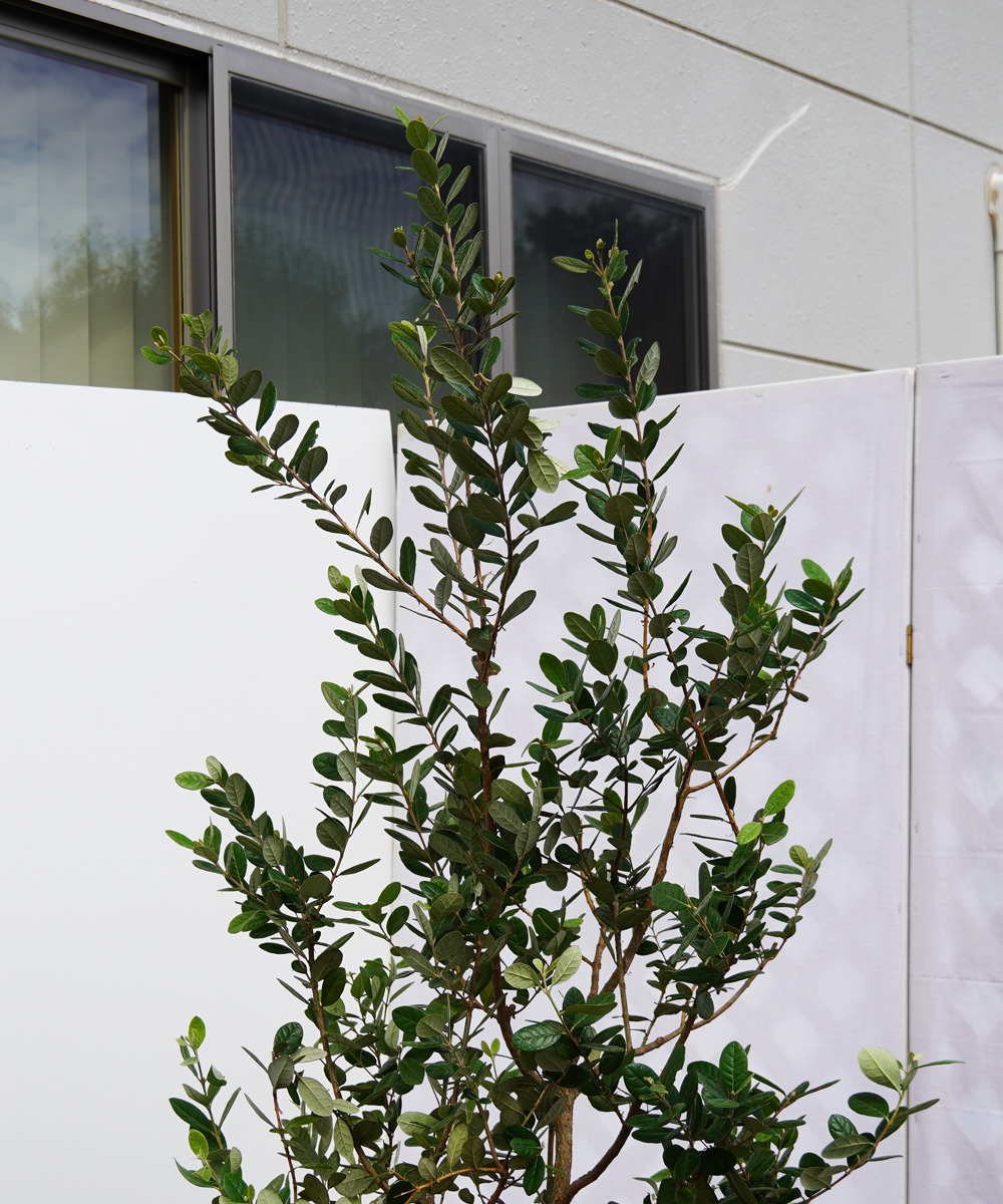 - フェイジョアは、南米原産の常緑果樹です。日本では果物としては定着せず、そのまま家庭菜園用の果樹となりましたが、常緑で丸く青みがかった葉色が特徴的で、あまり大きくならない庭木として近年注目されています。しかし、フェイジョアは果樹として販売されることが多いため、樹形が整ったものが多くありません。こちらは、庭木として使えるように樹形をきれいに仕立てています。もともとは中木に近いため、最終樹高はそれほど大きくなりません。なのでそこそこの大きさで、樹形をきれいに仕立ててあるものはあまり販売されていません。こちらのフェイジョアは品種不明のため花が咲いても結実しない場合があります。