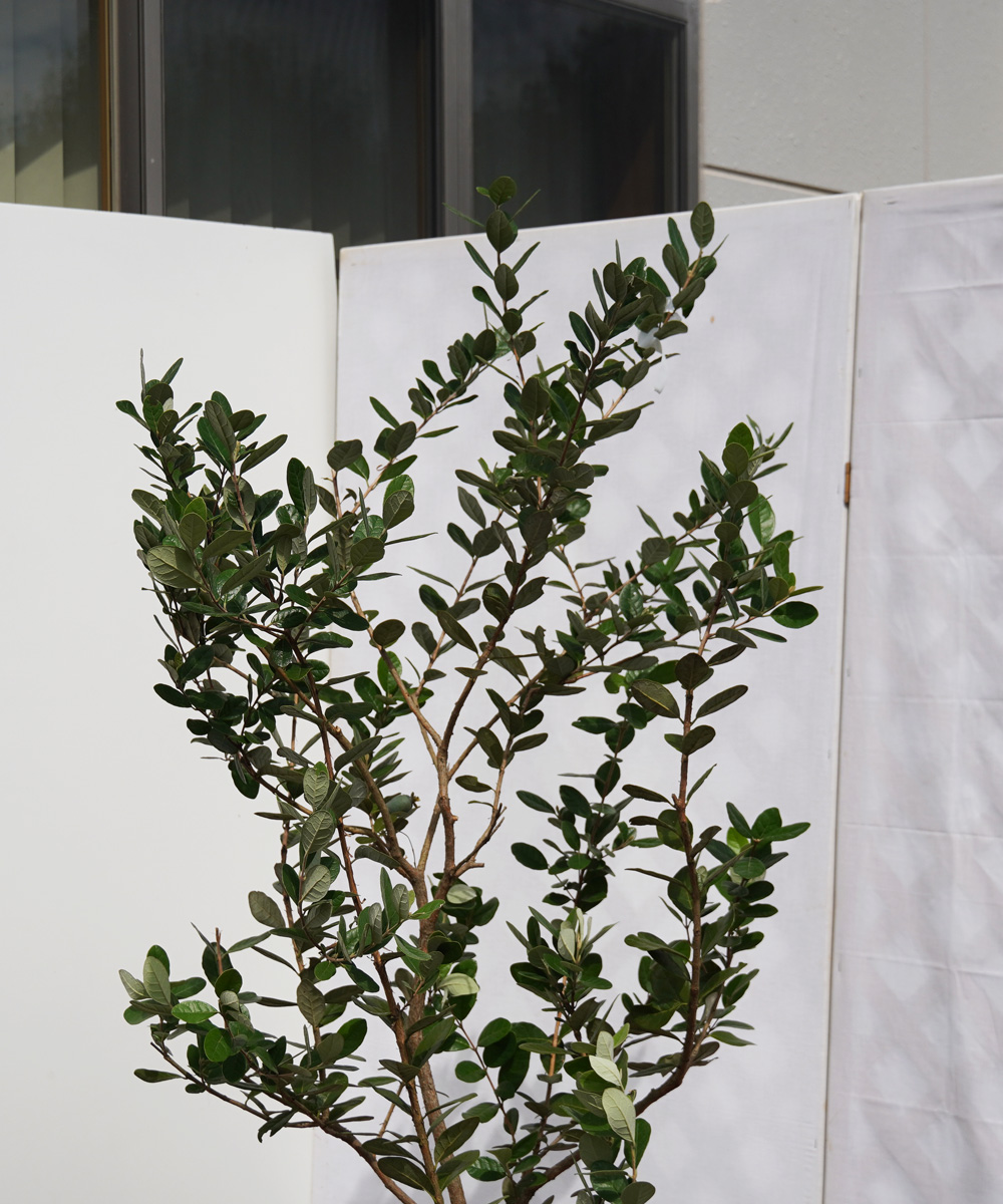 - フェイジョアは、南米原産の常緑果樹です。日本では果物としては定着せず、そのまま家庭菜園用の果樹となりましたが、常緑で丸く青みがかった葉色が特徴的で、あまり大きくならない庭木として近年注目されています。しかし、フェイジョアは果樹として販売されることが多いため、樹形が整ったものが多くありません。こちらは、庭木として使えるように樹形をきれいに仕立てています。もともとは中木に近いため、最終樹高はそれほど大きくなりません。なのでそこそこの大きさで、樹形をきれいに仕立ててあるものはあまり販売されていません。こちらのフェイジョアは品種不明のため花が咲いても結実しない場合があります。
