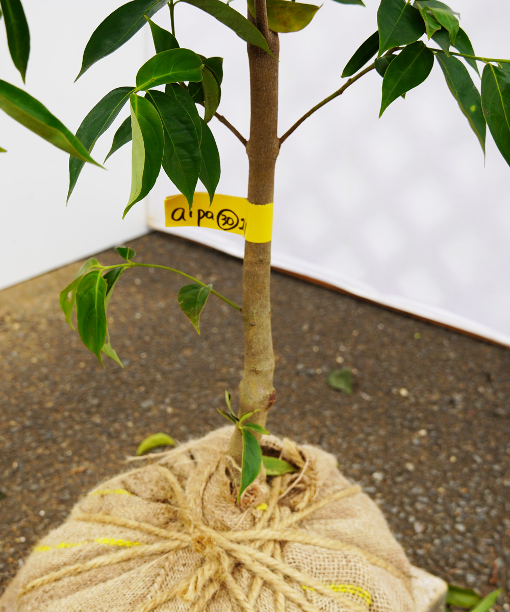 こちらの商品は幹が柔らかく自立しません。その為商品画像では幹の曲がりが確認できます。この曲がりを直すための支柱を同梱包致しますので、植え付けの際にご使用ください。