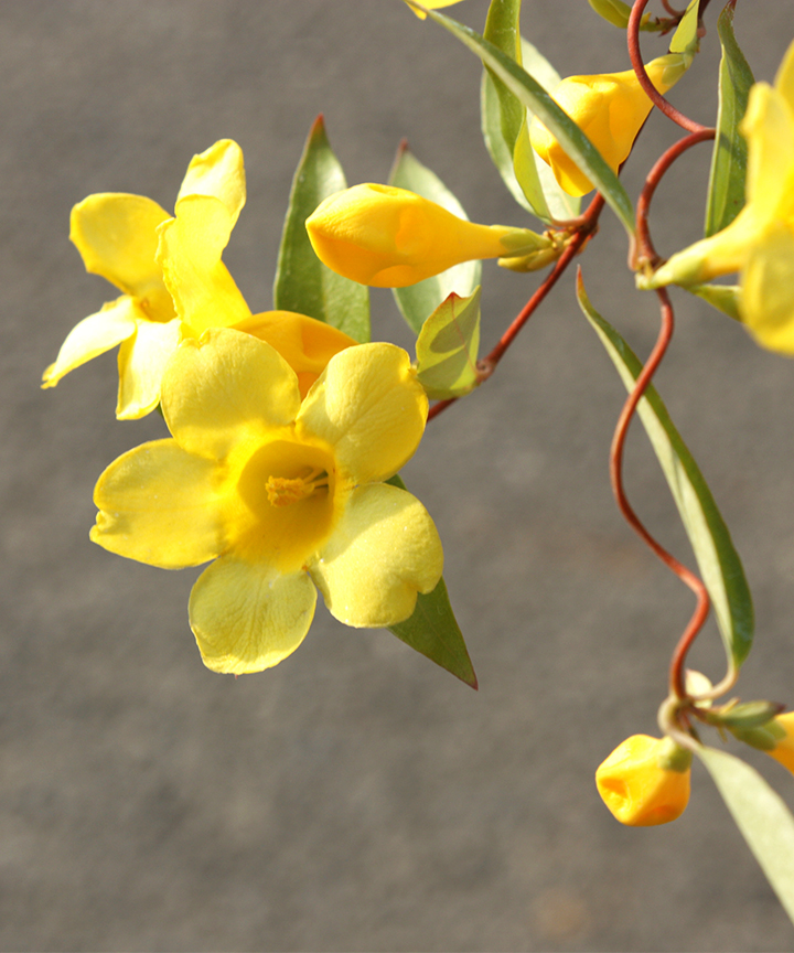 - 成長の早い常緑のつる植物です。フェンスやアーチ、パーゴラなどに絡ませるようにして利用します。巻きついた後は、ボリュームが出るので欧米風の雰囲気が出ます。3∼4月ごろにほのかな香りのする黄色い花を咲かせます。