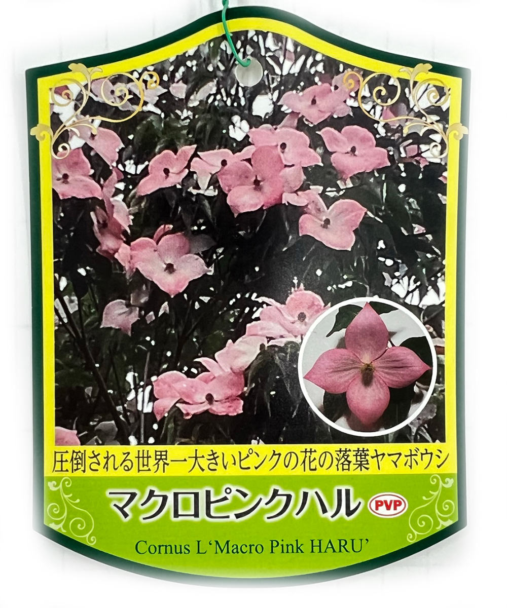 - 落葉ヤマボウシ「マクロピンクハル」は、ヤマボウシでピンク系の花では世界最大サイズになる品種です。花の直径は最大で15㎝です。また花の形も、丸みを帯びた花弁(ガク)で、花弁同士は重なり合い大きさボリューム共に圧倒されるほどの大きさです。男性の掌がほぼ隠れるサイズ感です。色味も環境によっては濃いピンクになりますが、平均するとやや薄めのピンク色で、こちらもとてもきれいです。花が大きくきれいなため、切り花にしても楽しめます。また樹形は直立性で自然に美しい樹形に育ちます。こちらはパテント管理されている商品のため、生産数は限られます。植え付けて1~2年は白っぽい花が咲くことがありますが、数年で本来の色の花を楽しめます。日陰に植えると、花付きが悪くなることがあります。