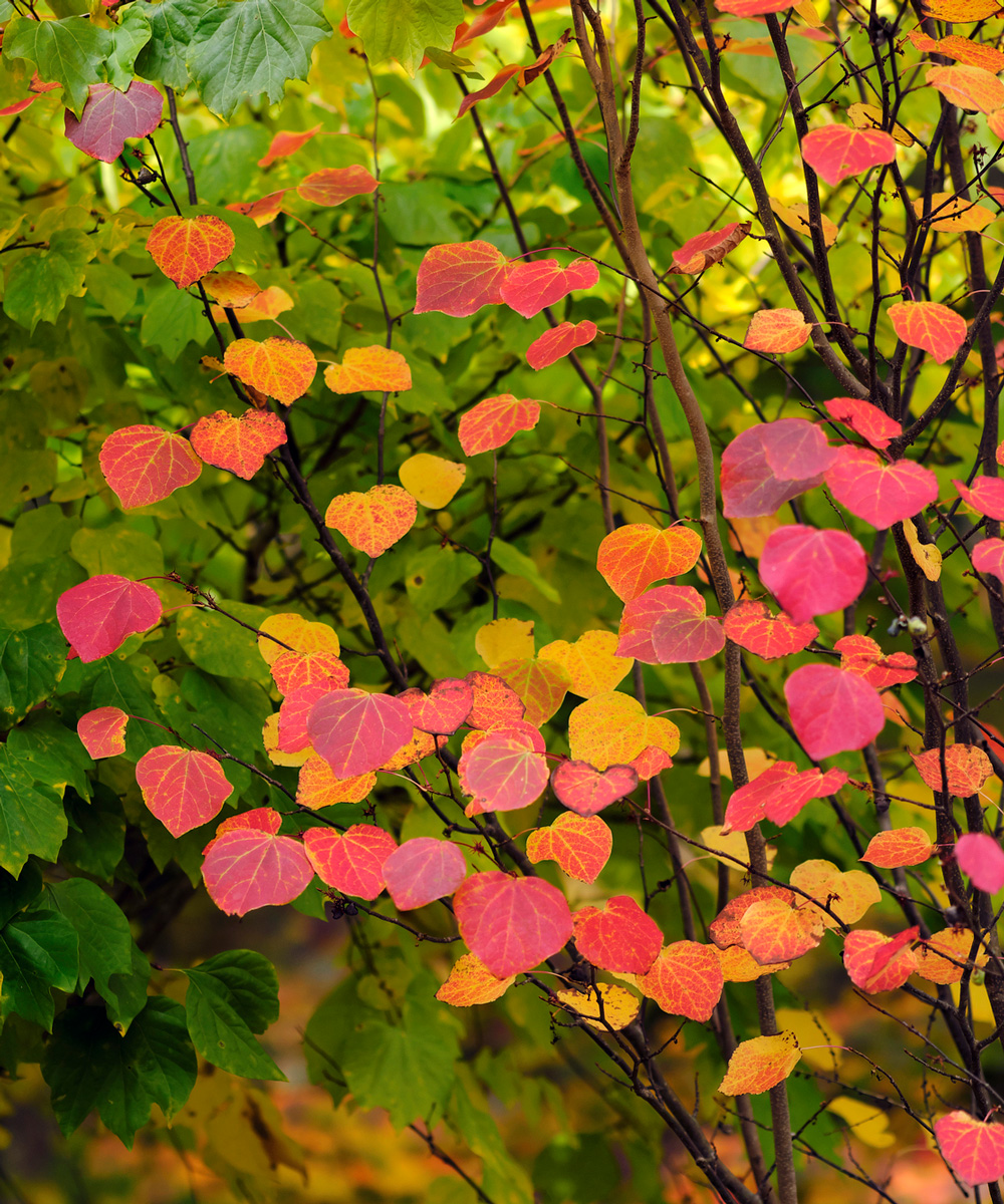 - ハート型に見える丸い葉から「マルバノキ」という名前が付けられました。10~11月頃に暗赤色で星形の小さな花をつけ、紅葉と花を一緒に楽しめるのも魅力です。