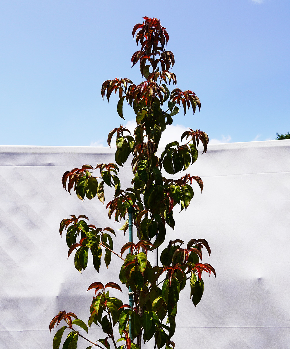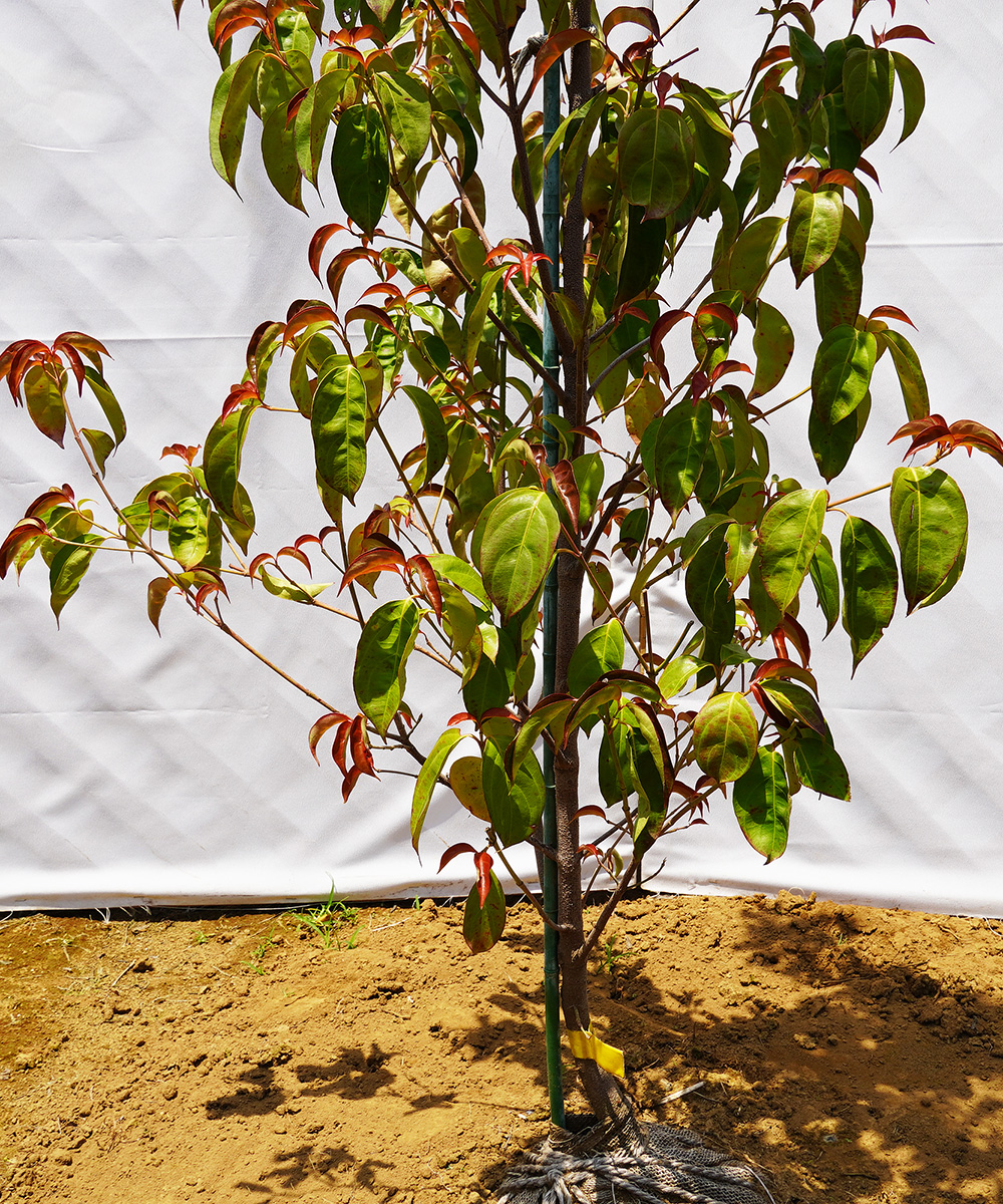特徴的なのは、常緑ヤマボウシの中でも濃い赤色の花と、形が剣弁と呼ばれる花びら(ガク)の先が細くヤマボウシらしい形をしています。常緑ヤマボウシの白花定番品種ホンコンエンシスの花の形に似ています。更に幼葉が赤色をしていることから花の時期には、赤い花と幼葉の赤さを楽しむことができます。さらに、樹形も直立性を帯びておりまとまりやすくお庭でも育てやすくなっています。他の常緑ヤマボウシの赤花品種の中では生育は比較的緩やかです。