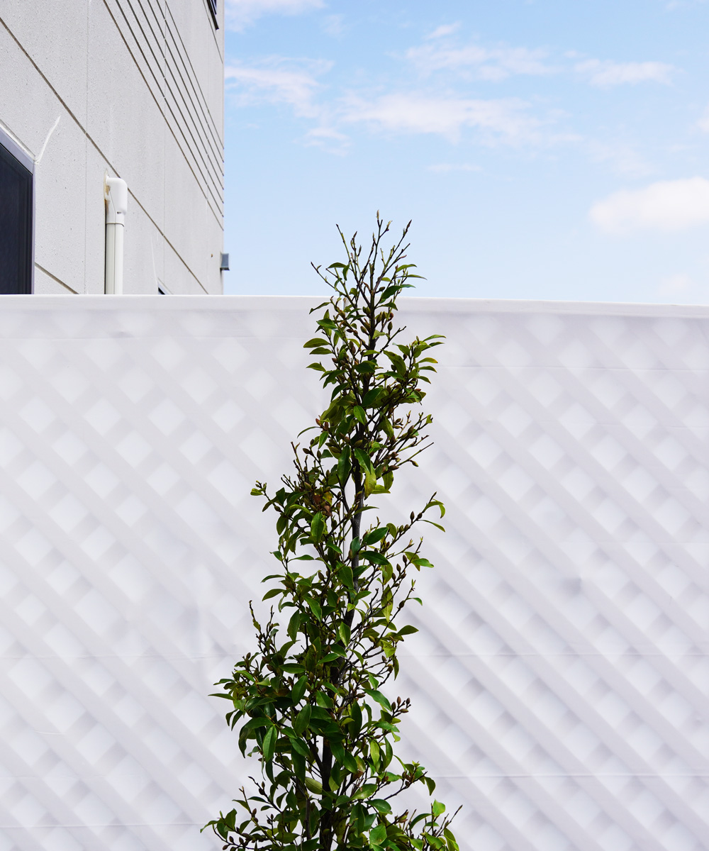 葉は小葉でつやがあり常緑樹の中でもとても爽やかな印象です。常緑樹では爽やかでさりげない存在感のものが少ないためとても重宝します。また成長も遅く最大樹高も3m程度の為、目隠しとして使えつつも扱いやすいため初心者の方でもとても安心です。
