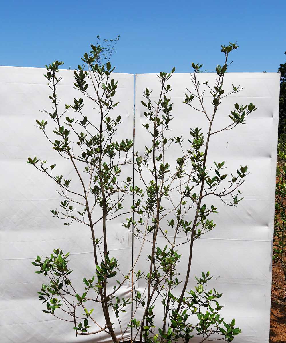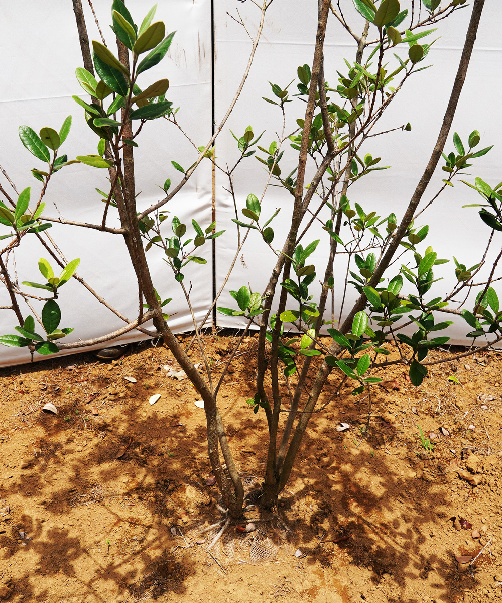 - フェイジョアは、南米原産の常緑果樹です。日本では果物としては定着せず、そのまま家庭菜園用の果樹となりましたが、常緑で丸く青みがかった葉色が特徴的で、あまり大きくならない庭木として近年注目されています。しかし、フェイジョアは果樹として販売されることが多いため、樹形が整ったものが多くありません。こちらは、庭木として使えるように樹形をきれいに仕立てています。もともとは中木に近いため、最終樹高はそれほど大きくなりません。なのでそこそこの大きさで、樹形をきれいに仕立ててあるものはあまり販売されていません。こちらのフェイジョアは品種不明のため花が咲いても結実しない場合があります。
