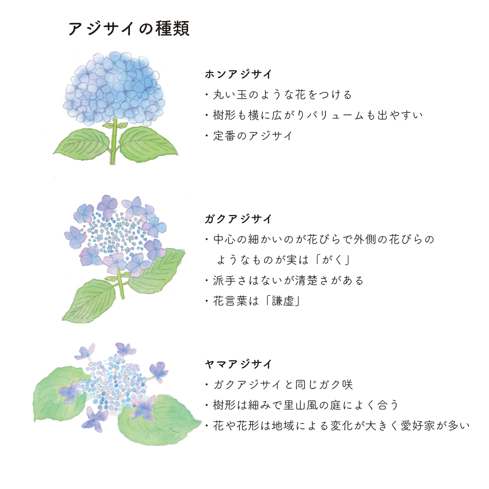 ひとえにアジサイといっても、花の形や色など複数の品種に分かれます。その中には、洋風はもちろんのこと、雑木のお庭にぴったりの品種もあります。